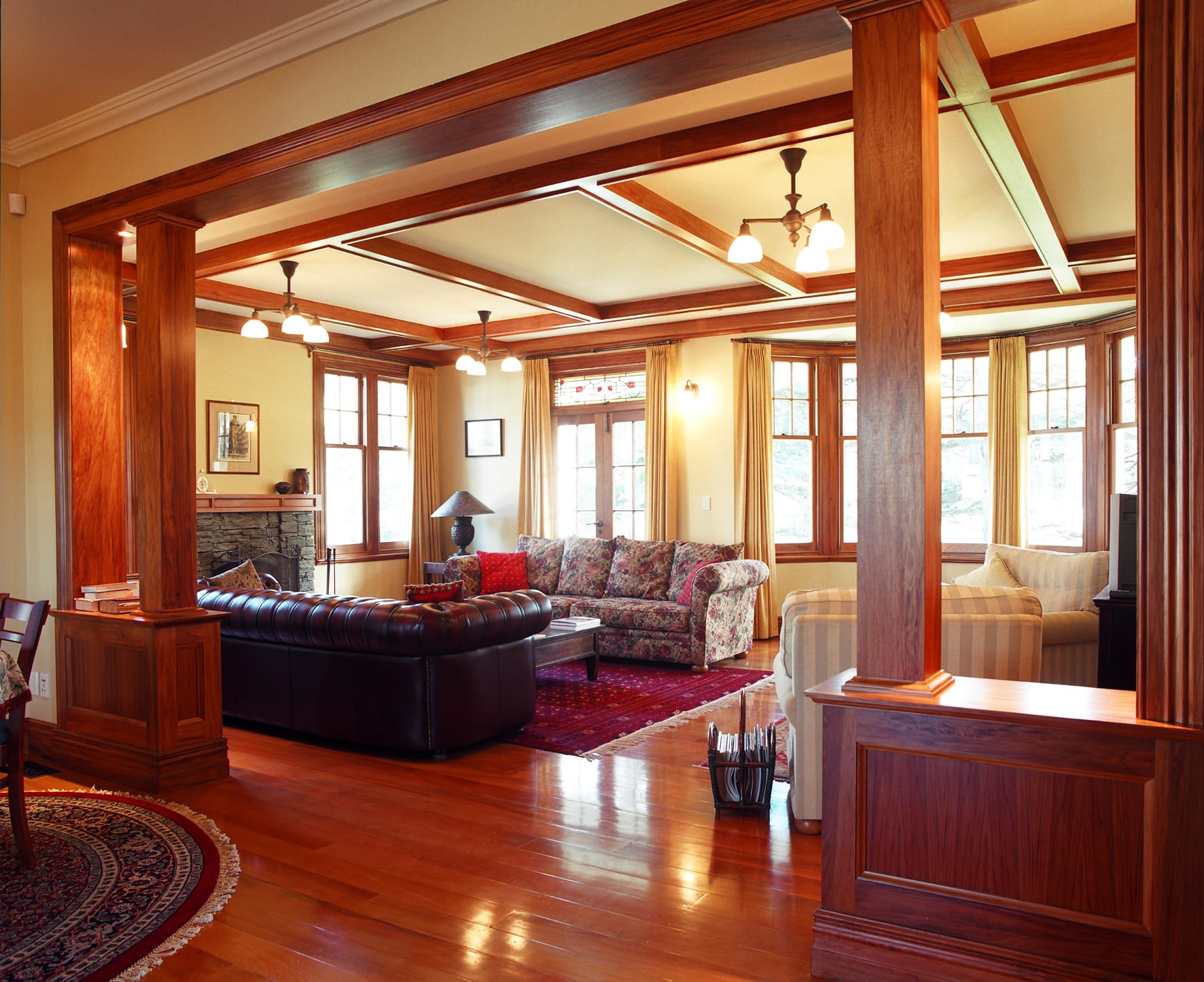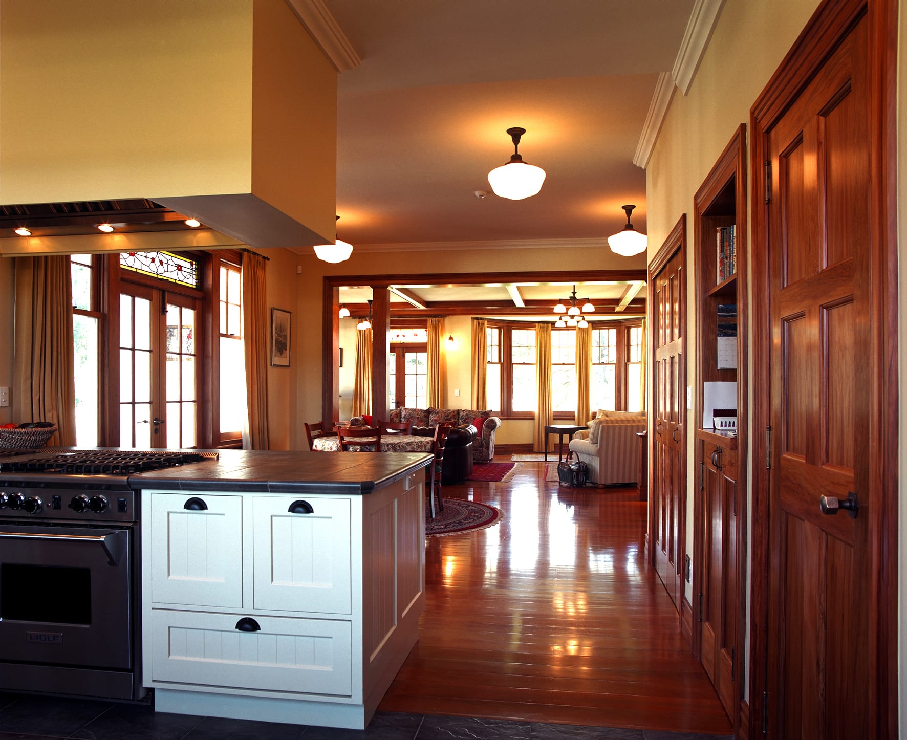 All aspects were designed in the traditional aesthetic of the American-style bungalow, using carefully selected native New Zealand timbers of Rimu and Matai for the floors, doors and bay windows. Colours, finishes and lighting were sensitively selected to relate to the period.