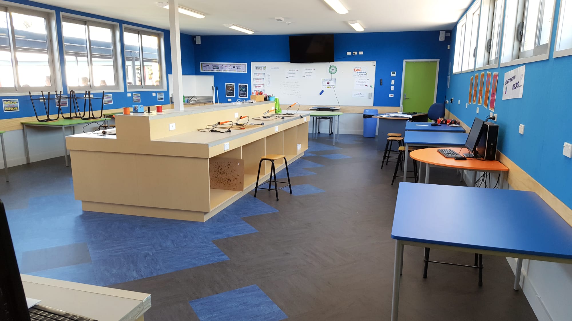 This project re-modelled existing technology specialist spaces – food technology, metalwork, wood-wood. Acoustic improvements were made in the food technology area. A large sun shading structure was included in the external courtyard to assist in creating an external space that the students are pleased to use.